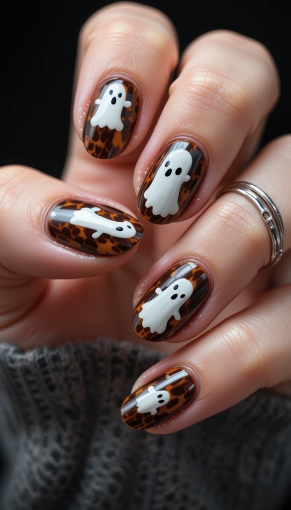 A classic brown-and-black leopard print base frames five tiny smiling ghost decals — each with rosy cheeks and simple black eyes. The contrast is playful, modern, and full of autumn energy, making this look ideal for those who love wild patterns with a touch of sweetness.