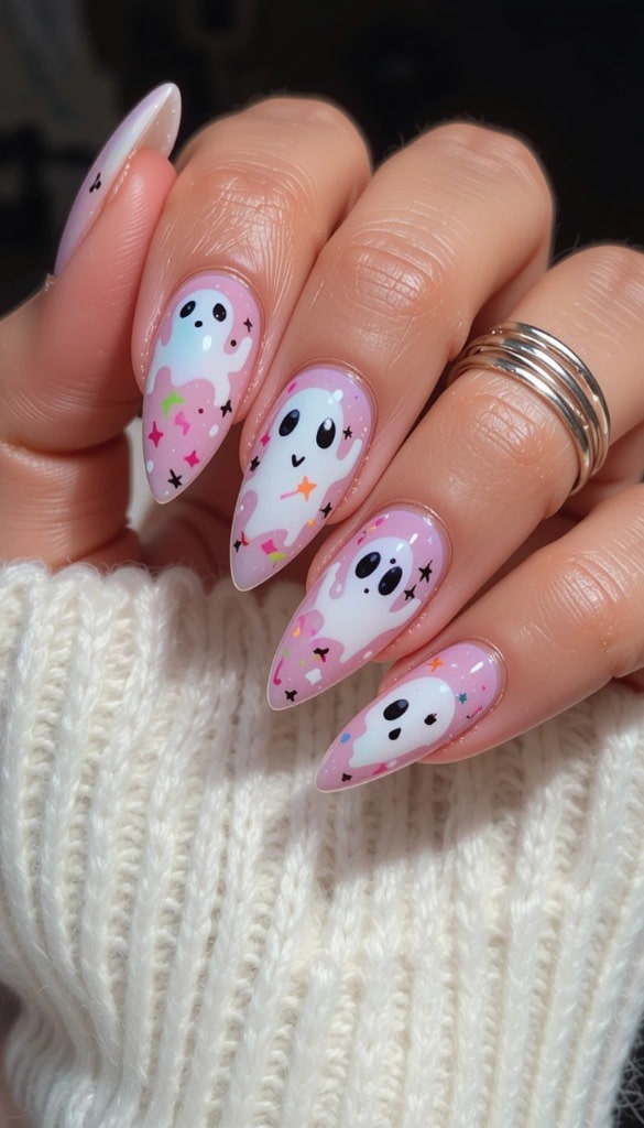A buttery pink glossy base lets five smiling ghost decals shine — each outlined in soft white with rosy cheeks and surrounded by tiny stars in pink, green, orange, and black. The look is cheerful, romantic, and full of Halloween joy — like wearing a candy-colored spell on your fingertips.