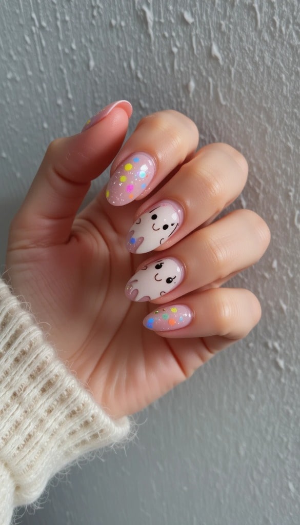 A natural nude glossy base frames two accent nails featuring cheerful ghost decals with simple black eyes and rosy cheeks, while the others shimmer with scattered rainbow polka dots. The look is sweet, modern, and full of playful energy — perfect for those who love color without clutter.