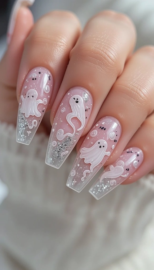 A soft pink glossy base frames five accent nails — each featuring a cheerful ghost decal with simple black eyes and rosy cheeks, surrounded by tiny silver bubbles and glitter. The look is sweet, romantic, and full of autumn joy — like wearing a bubblegum spell on your fingertips.