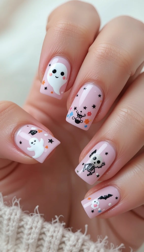 A cheerful pink glossy base frames five accent nails — each featuring a different cute Halloween character: a smiling ghost, a tiny skeleton, a bat with rosy cheeks, a witch’s hat, and a spider. Tiny stars and colorful dots add playful charm, making this look perfect for those who love festive fun without being scary.