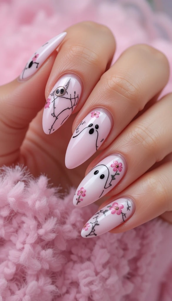 A buttery pink glossy base frames five accent nails — each featuring a simple ghost decal with black eyes and rosy cheeks, surrounded by delicate pink flower vines with green stems. The look is romantic, whimsical, and full of autumn sweetness — perfect for those who love nature-inspired drama with a touch of Halloween charm.