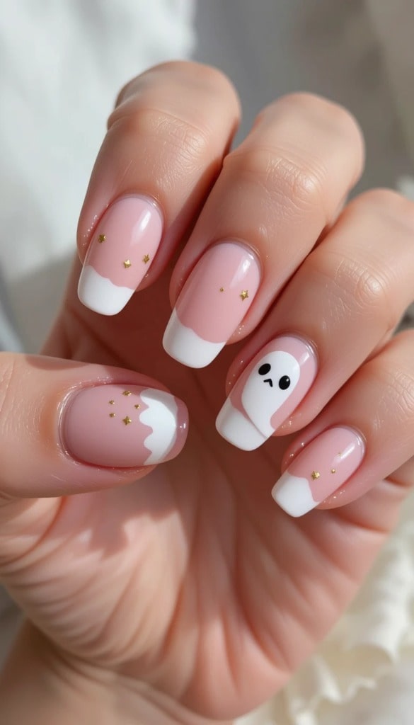 A natural nude glossy base frames clean white French tips — one nail features a single smiling ghost decal with rosy cheeks and a wavy bottom edge. Tiny gold stars dot the edges for a touch of sparkle, making this look ideal for those who love subtle texture with a hint of Halloween magic.