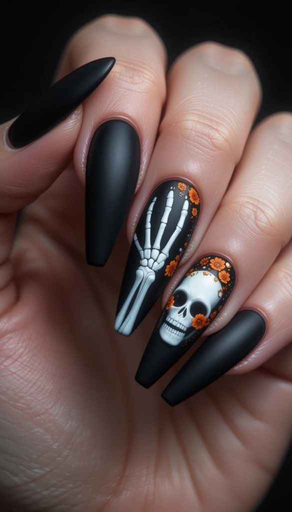 A velvety matte black base frames two accent nails — one featuring a delicate sugar skull adorned with orange marigolds, the other showcasing a white skeletal hand. The contrast is moody, artistic, and full of quiet sophistication — like wearing a Dia de los Muertos wreath on your fingertips.