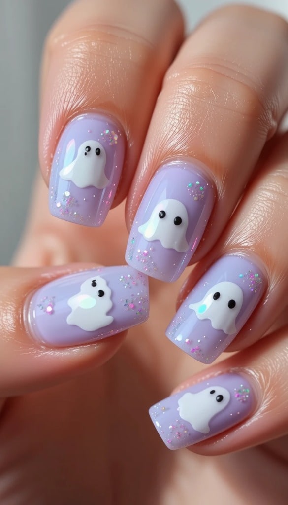 A dreamy lavender glossy base frames five tiny 3D ghost decals — each with simple black eyes and a sweet, floating shape. Scattered rainbow glitter adds a magical, whimsical glow that makes this look perfect for those who love Halloween charm without the scare.