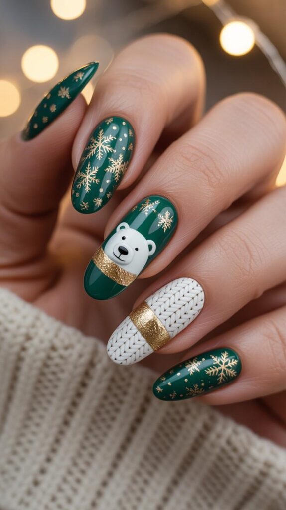 “Glossy emerald green polish frames delicate gold snowflakes on each nail, while the ring finger steals the show with a giant polar bear face — complete with black eyes and an orange nose. Another nail features a tiny knit pattern — sweet, serene, and totally wearable.”