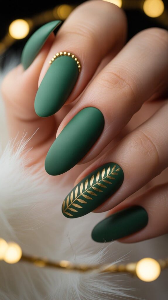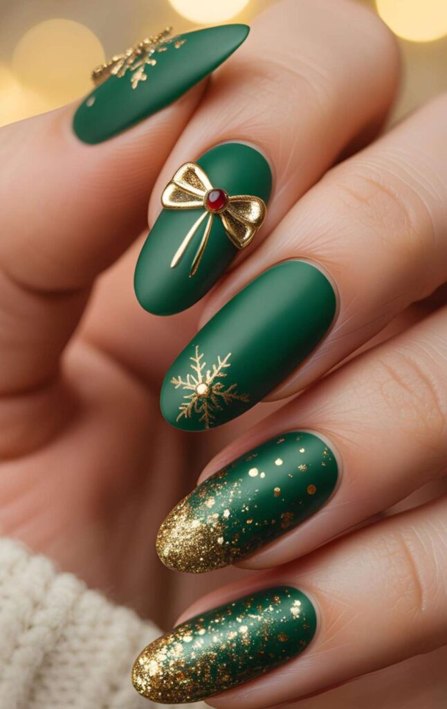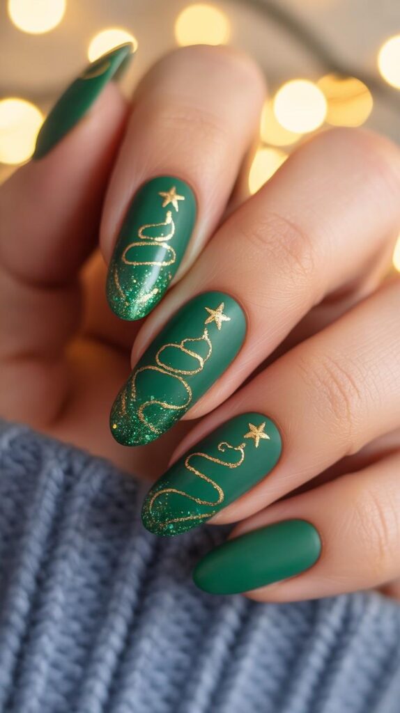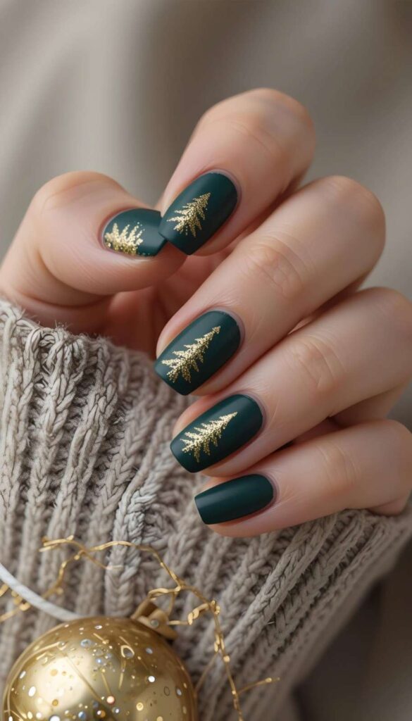 “Matte emerald green polish frames delicate gold trees on each nail, while the ring finger steals the show with a giant glitter accent that sparkles like fresh snow. It’s clean, elegant, and totally photo-ready — like wearing a winter art exhibit on your fingertips.”