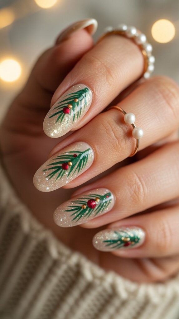 “Soft nude polish frames crisp green tips on four nails, while the ring finger steals the show with a giant pine branch — complete with gold Glitter Base. The rest? Clean, classic, and totally low-key — chic, understated, and perfect for everyday wear.”