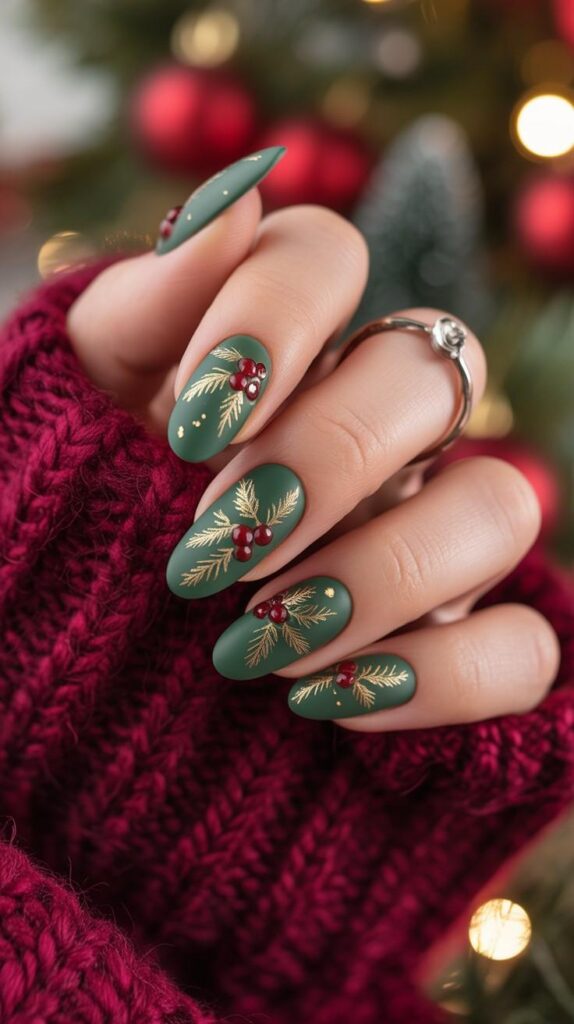 “Glossy emerald green polish frames delicate gold holly leaves on each nail, while the ring finger steals the show with a giant berry accent that sparkles like fresh snow. The rest? Clean, classic, and totally low-key — chic, understated, and perfect for everyday wear.”