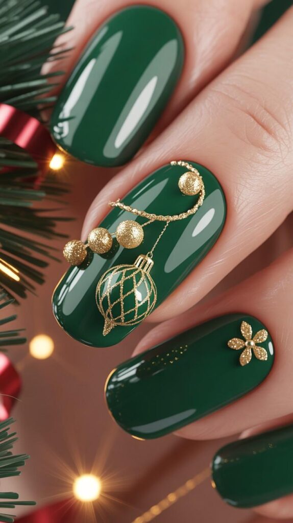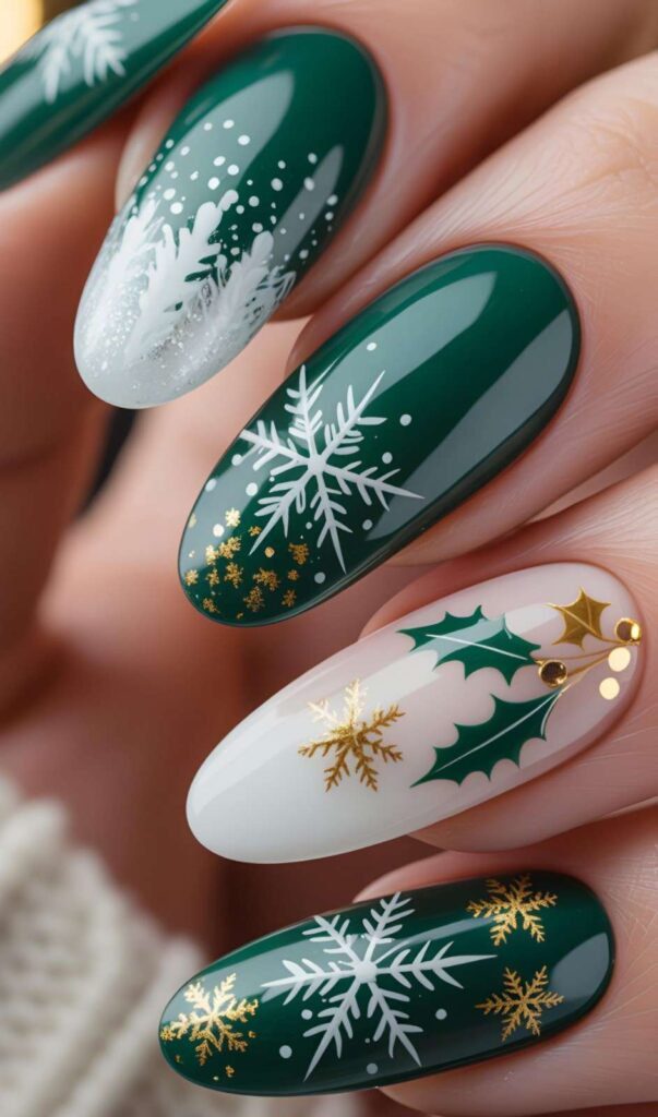 “Glossy emerald green polish frames delicate gold snowflakes on each nail, while the ring finger steals the show with a giant holly leaf — complete with a gold star. The rest? Clean, classic, and totally low-key — chic, understated, and perfect for everyday wear.”