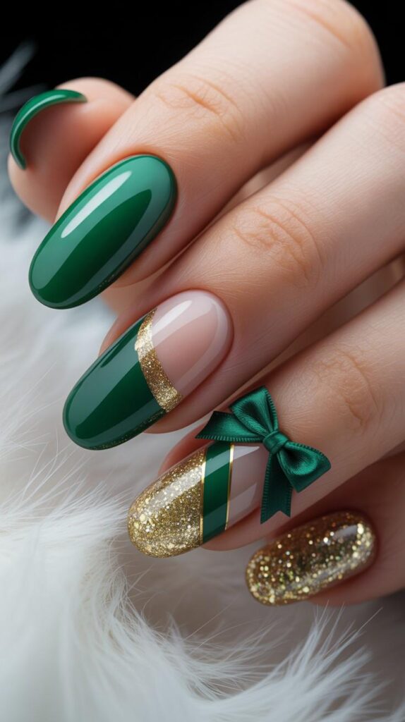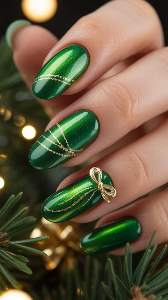 “Glossy emerald green polish frames delicate gold stripes on each nail, while the ring finger steals the show with a giant bow — complete with a gold star. The rest? Clean, classic, and totally low-key — chic, understated, and perfect for everyday wear.”