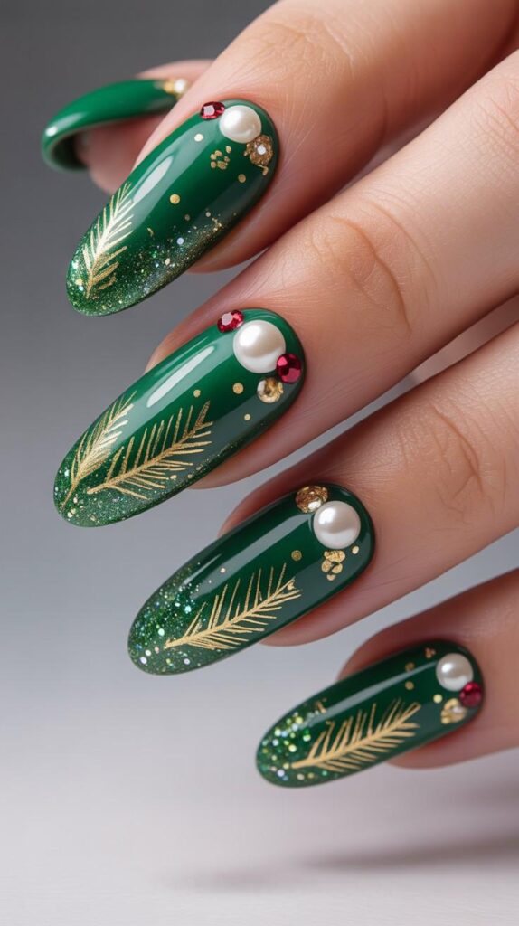 “Glossy emerald green polish frames delicate gold pine branches on each nail, while the ring finger steals the show with a giant pearl accent that sparkles like fresh snow. The rest? Clean, classic, and totally low-key — chic, understated, and perfect for everyday wear.”