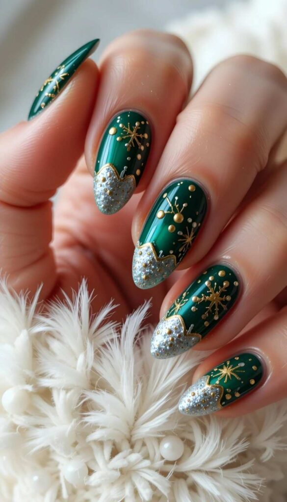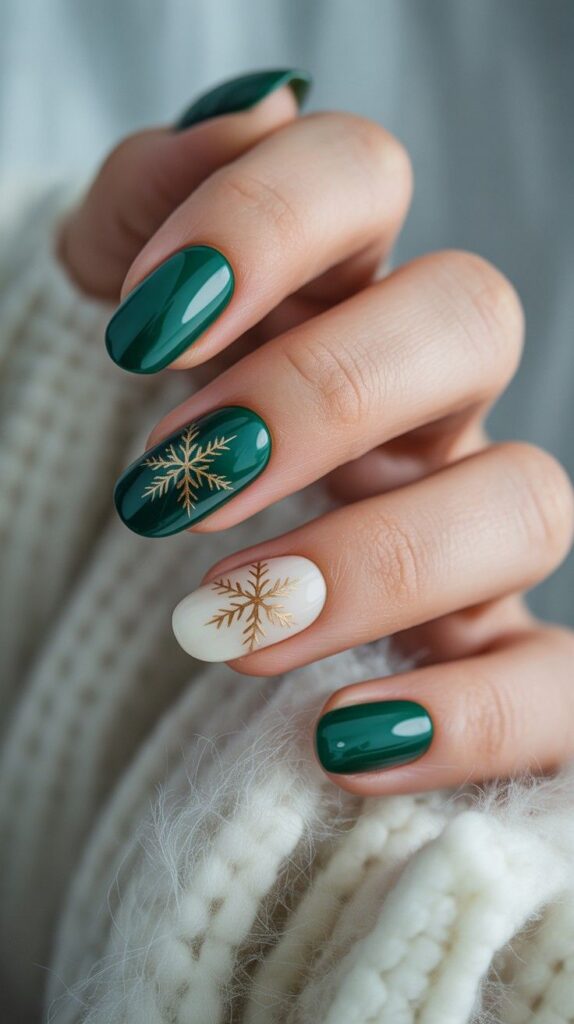 “Glossy emerald green polish frames delicate gold snowflakes on each nail, while the ring finger steals the show with a giant glitter accent that sparkles like fresh snow. The rest? Clean, classic, and totally low-key — chic, understated, and perfect for everyday wear.”