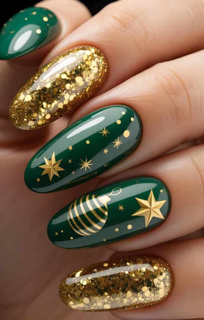 “Glossy emerald green polish frames delicate gold stars on each nail, while the ring finger steals the show with a giant ornament — complete with a gold star. The rest? Clean, classic, and totally low-key — chic, understated, and perfect for everyday wear.”
