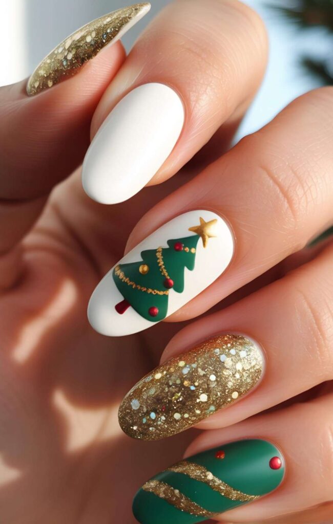 “Soft white polish frames crisp green tips on four nails, while the ring finger steals the show with a giant tree face — complete with a gold star. It’s clean, elegant, and totally photo-ready — like wearing a winter art exhibit on your fingertips.”