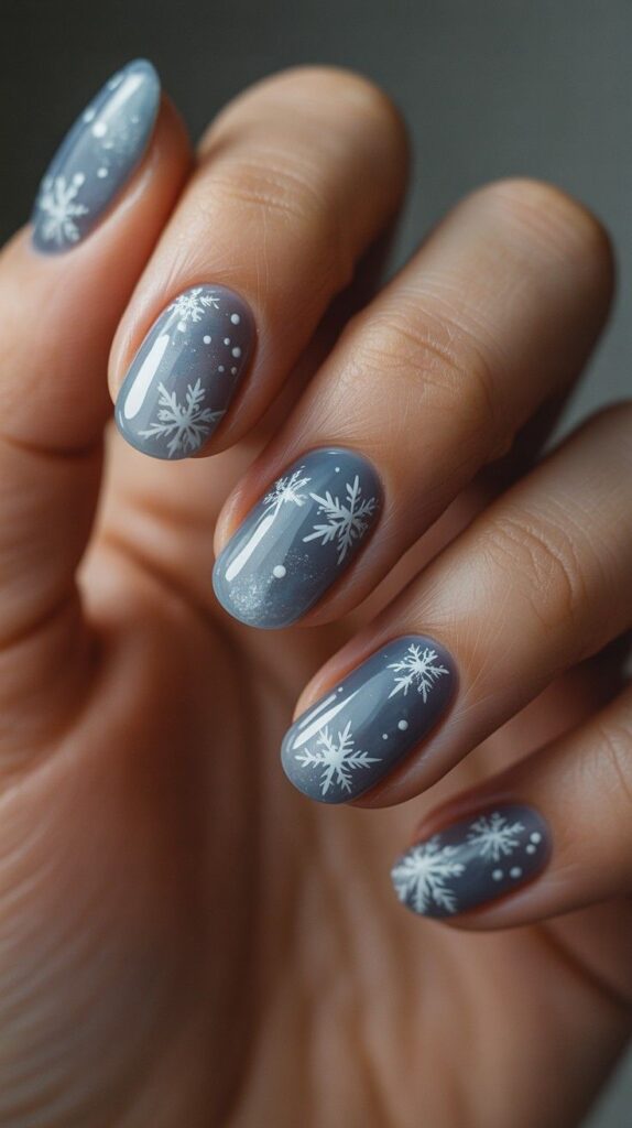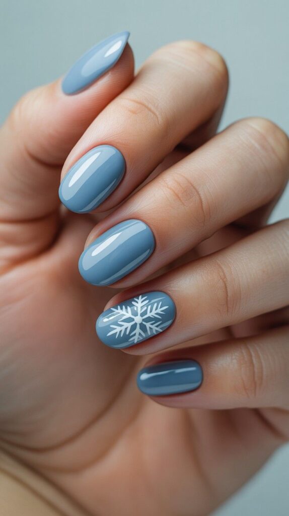 Cool dusty-blue gel base meets intricate white snowflake decals in varying sizes — serene, detailed, and deeply calming. The glossy finish enhances dimension, while the almond shape elongates the fingers with quiet confidence. Think: a curated winter art installation on your fingertips.