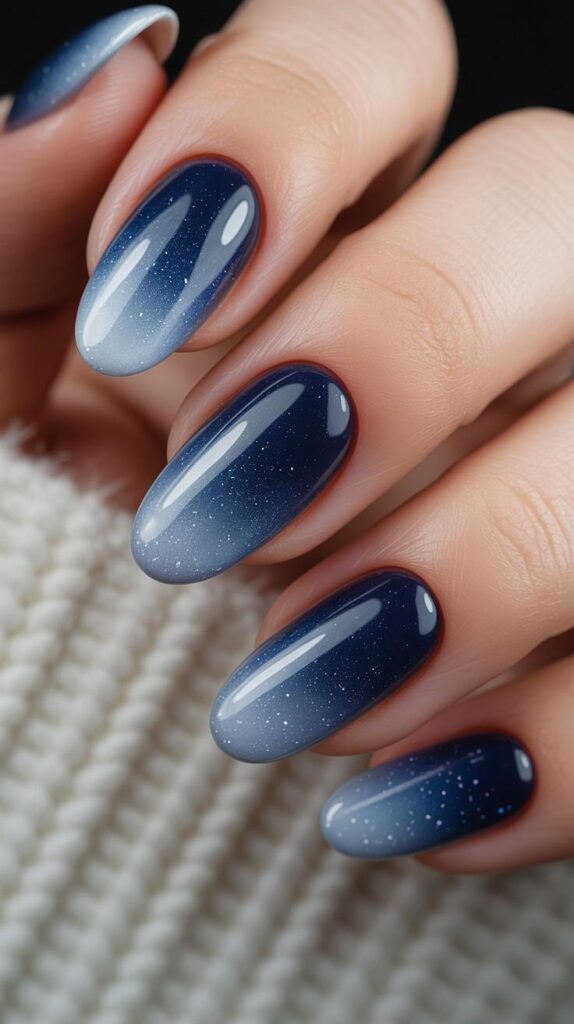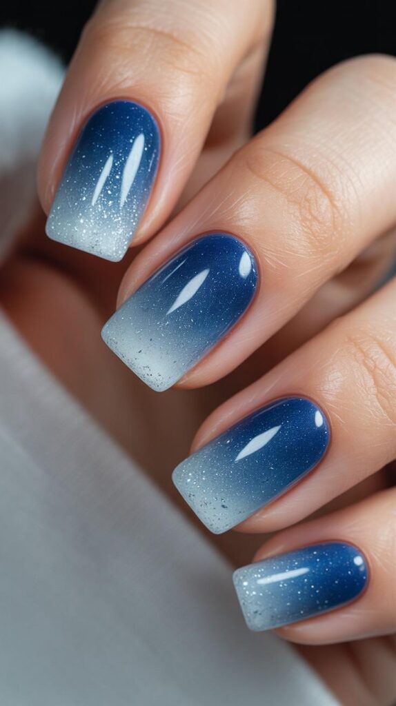Rich navy-to-ice-blue ombre polish meets delicate silver glitter — cool, ethereal, and perfect for showing off your winter elegance. The glossy finish catches light like frozen waves, while the soft square shape frames the hand with quiet sophistication. Paired with an ivory knit cuff, this design whispers ‘arctic serenity’ with every gesture.