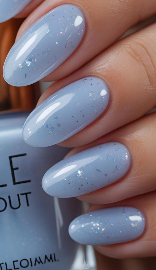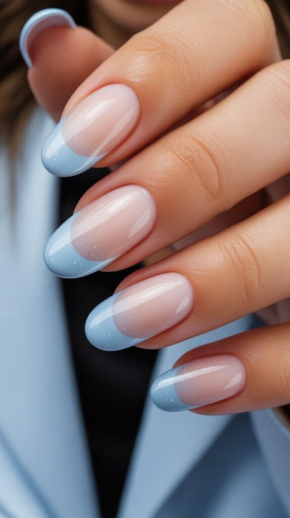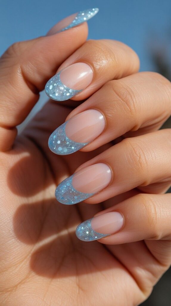 Creamy nude base meets delicate powder-blue frosted French tips with micro-glitter — clean, modern, and effortlessly elegant. The subtle shimmer catches light like morning frost on glass, while the oval shape offers timeless sophistication. A whisper of winter, not a shout — perfect for refined everyday glamour.