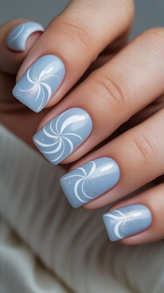 Powder-blue polish meets delicate white swirls and fine iridescent glitter — airy, joyful, and delicately sparkling. The spiral motif adds movement and whimsy, while the squoval shape keeps it grounded and elegant. Like catching sunlight on a glacier — cool, radiant, and full of quiet joy.