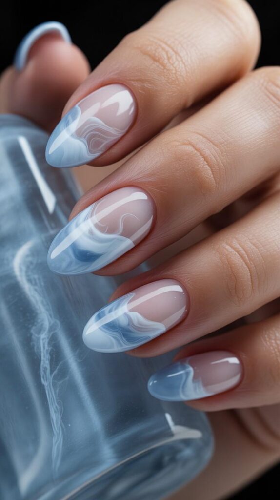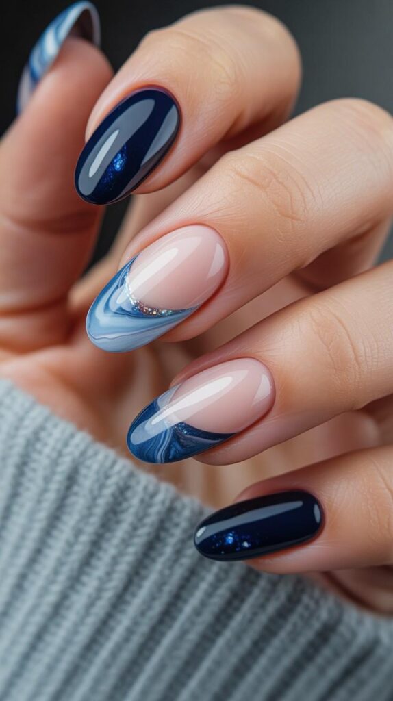 Deep navy blue meets soft sky-blue swirls on a nude base — modern, artistic, and perfectly balanced. The fluid marble effect mimics ocean currents beneath polar ice, while the almond shape enhances elegance. A sophisticated twist on the classic French, ideal for those who love subtle movement in their nail art.