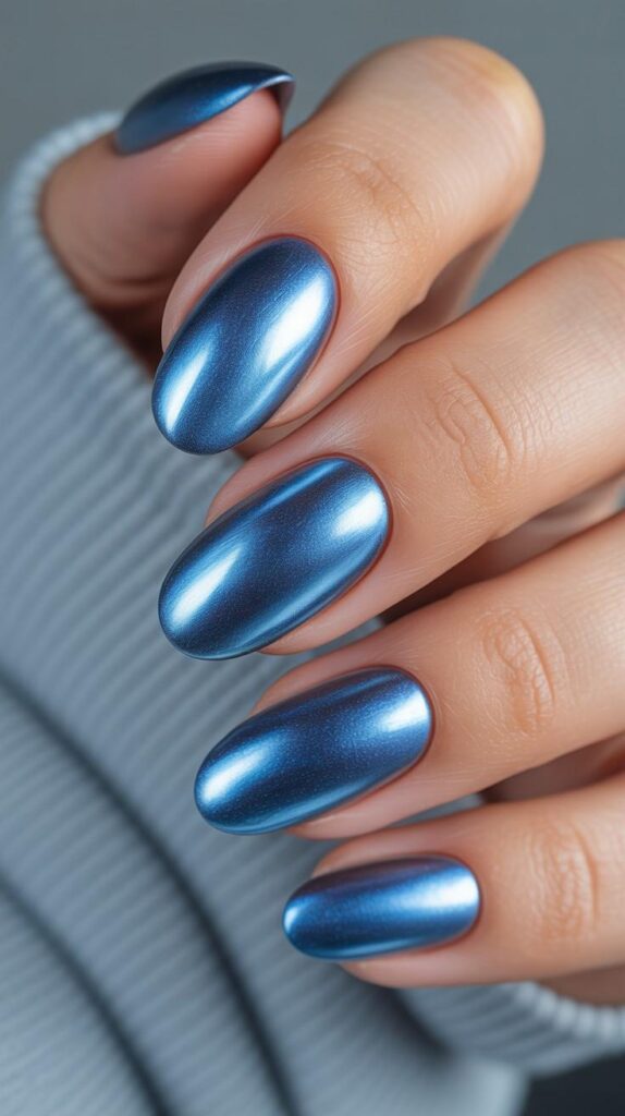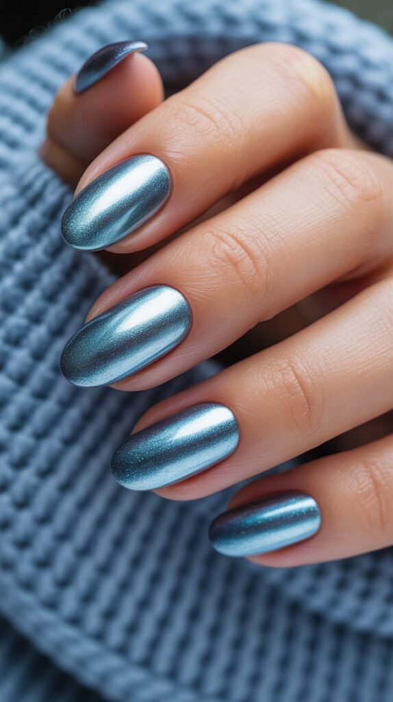 Sleek metallic aqua-chrome polish — liquid-ice perfection with a mirror-like sheen that shifts between teal and frost-blue. The rounded almond shape enhances its sculptural quality, and zero embellishment is needed: this design is the spotlight. Cool, confident, and undeniably modern.