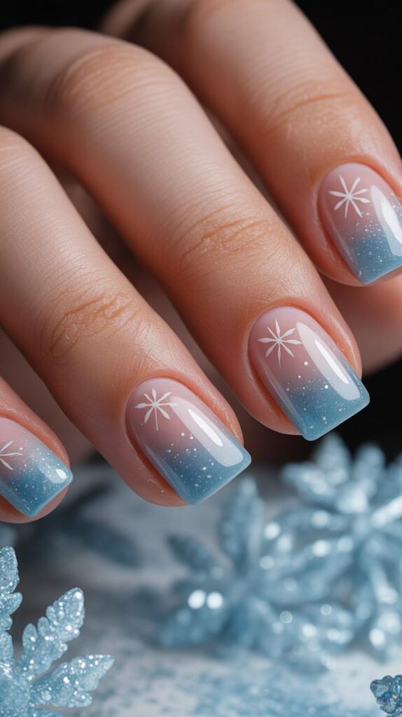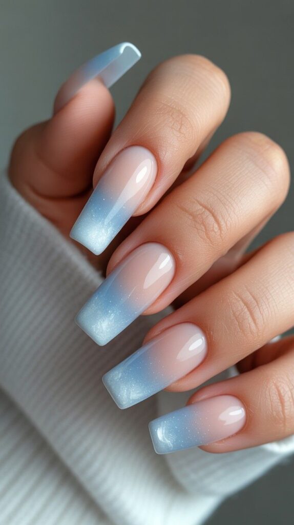 Pale sky-blue-to-nude ombre with a sheer frosted tip and micro-glitter — airy, dreamy, and delicately luminous. The gradient evokes morning mist over mountain lakes, while the subtle texture adds depth without heaviness. Perfect for those who love ‘barely-there’ luxury with a whisper of winter magic.
