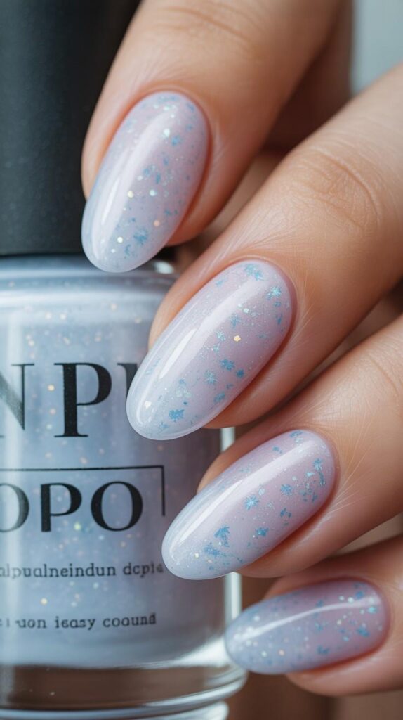 Soft lilac-tinged ice blue polish meets delicate snowflake-shaped glitter and iridescent flecks — ethereal, dreamy, and perfectly wintry. The sheer base allows skin tone to peek through, creating a luminous ‘frosted glass’ effect. Paired with a cozy knit sleeve, this design feels like stepping into a snow-dusted greenhouse at dawn.