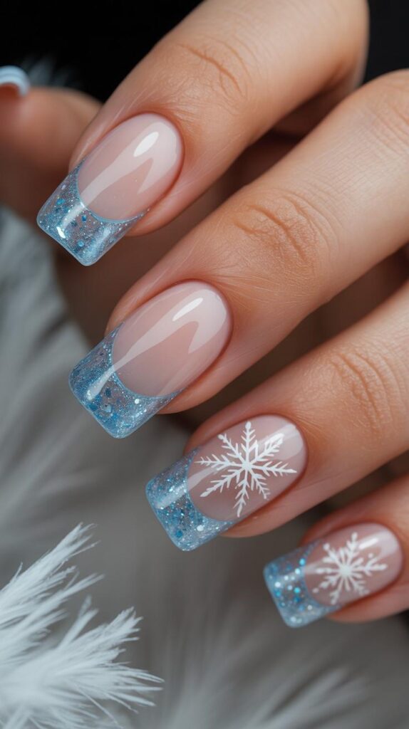 Soft nude base meets icy blue French tips layered with fine glitter and delicate white snowflake decals — playful, wintry, and perfectly balanced. The contrast between matte-nude and shimmering tips creates dimension, while the snowflakes add festive charm without looking overly themed. A true ‘elegant frost’ vibe.
