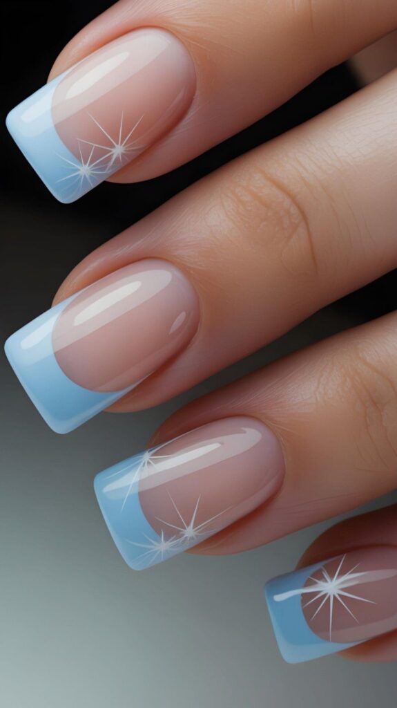 Soft nude base meets icy-blue French tips adorned with delicate white starburst accents — fresh, festive, and full of quiet sparkle. The radiating lines mimic frozen crystals catching sunlight, adding dimension without clutter. Ideal for those who want holiday spirit with editorial restraint.