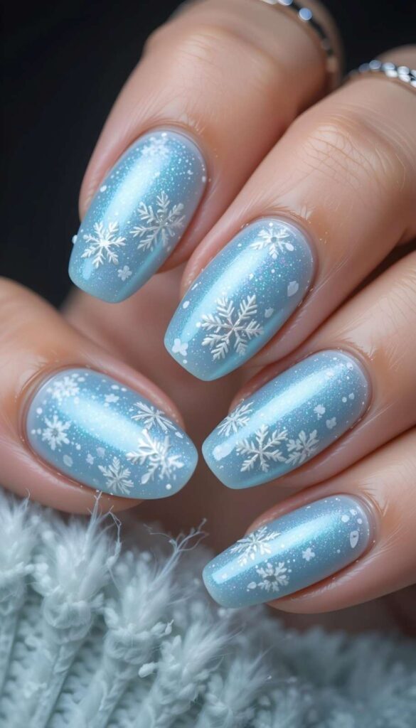 High-shine iridescent sky-blue polish layered with fine white snowflakes, micro-dots, and subtle holographic shimmer — magical, multidimensional, and utterly captivating. The light-refracting finish shifts from icy pearl to cool cerulean, mimicking fresh snow under sunbeams. A true ‘winter wonderland’ in miniature.