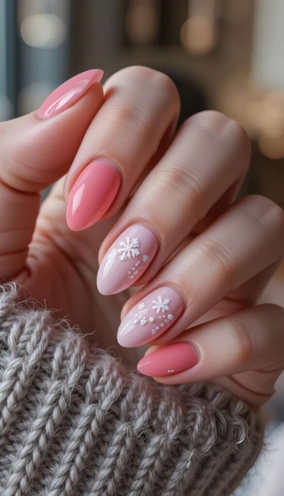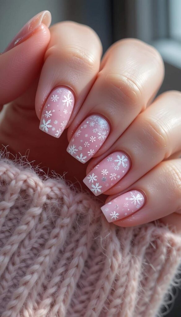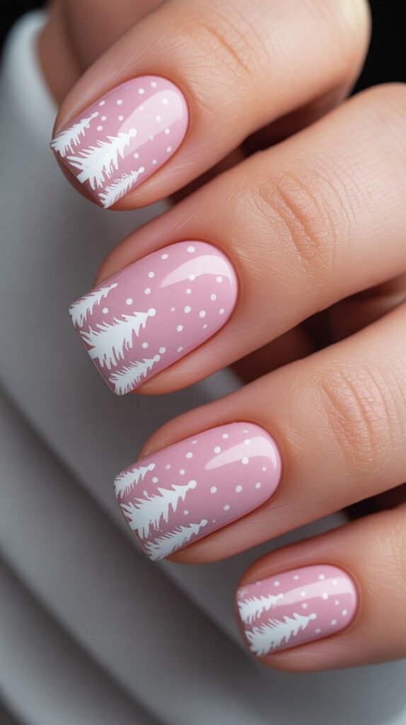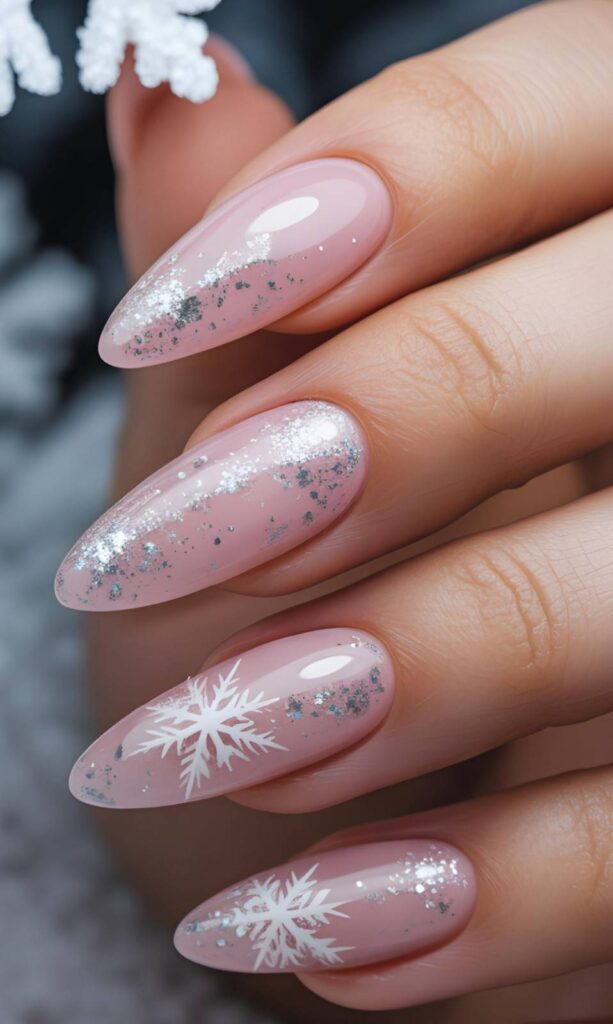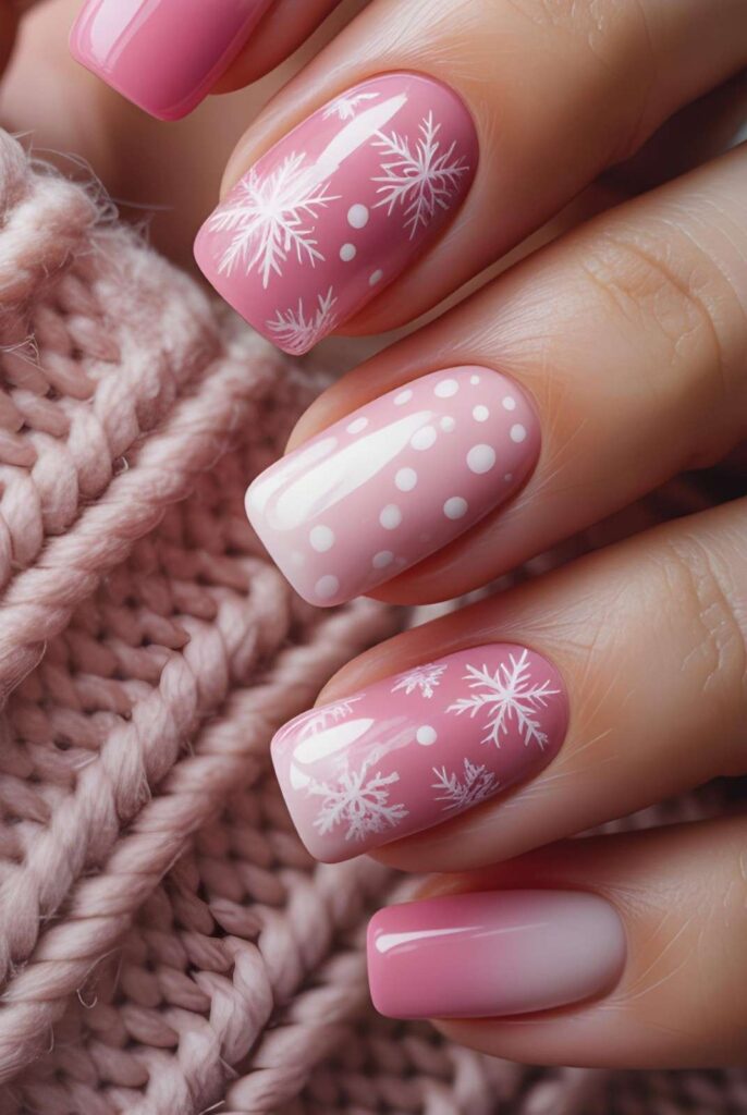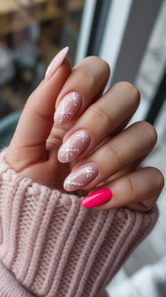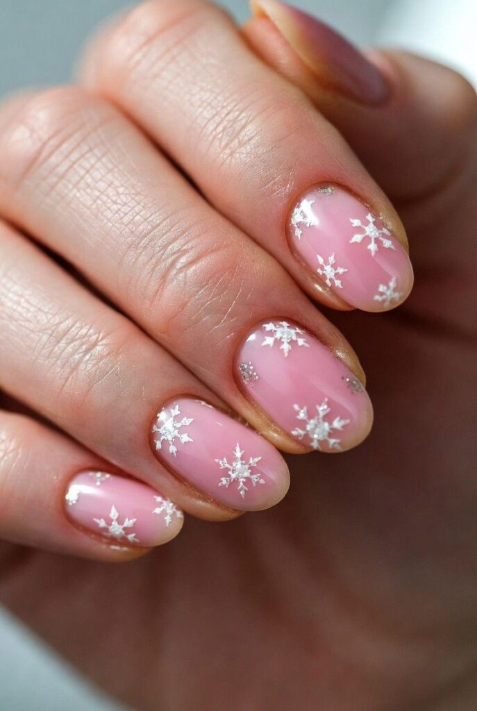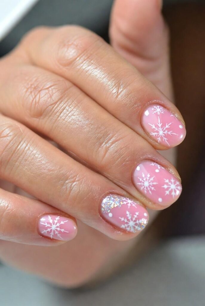 “Soft blush pink gel polish frames two accent nails — one with a delicate white stripe pattern, the other a glittery snowflake design. The remaining nails? Speckled with snowy white dots for that ‘just walked through a winter wonderland’ feel — elegant, whimsical, and totally photo-ready.”