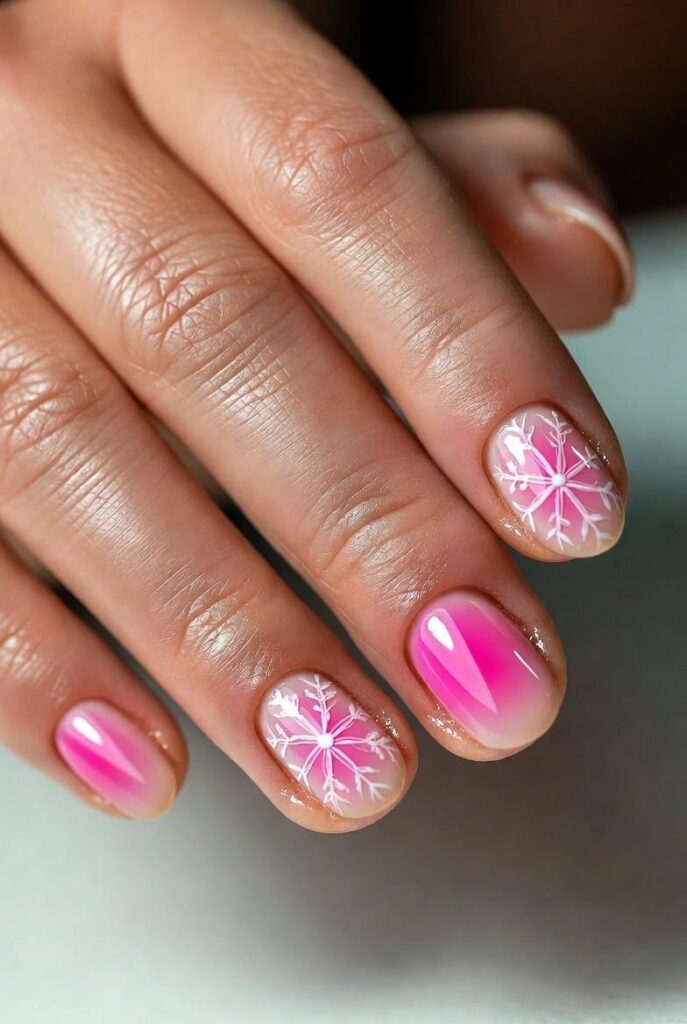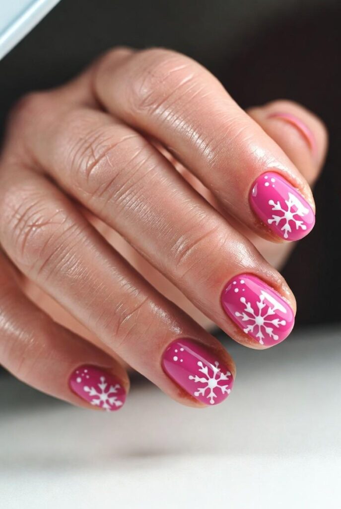 7) Minimalist Snowflake & Hot Pink Tips