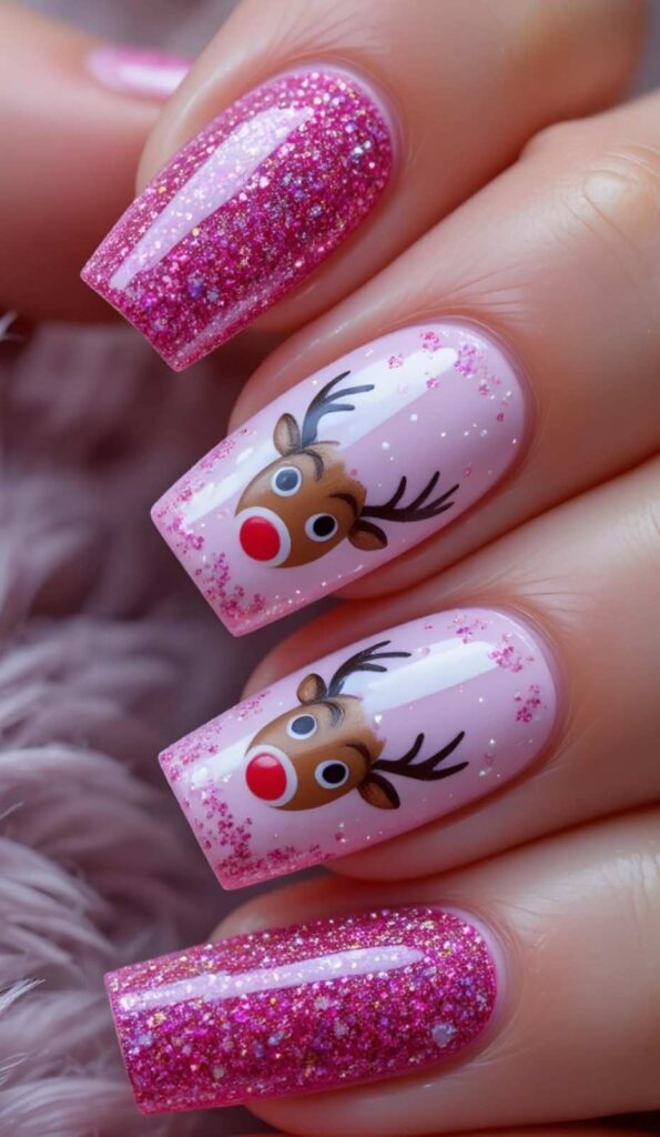 Forget basic red-and-green polish: these 21 pink winter designs are all about high-shine glamour, holiday whimsy, and that just-pulled-on-my-favorite-holiday-sweater vibe. Think candy cane swirls, reindeer faces, velvet red snowflakes, and galaxy ombres that look like they’ve been stitched onto your nails with pure holiday love.