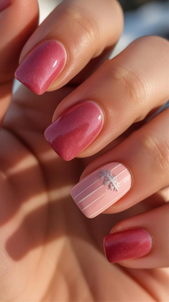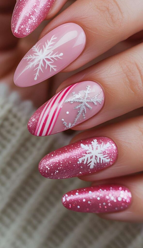 “Rich pink glitter coats four accent nails like winter confetti, while the ring finger steals the show with a glossy white-and-pink candy cane swirl. Another nail features a giant white snowflake — bold, sparkly, and totally Instagram-worthy.”
