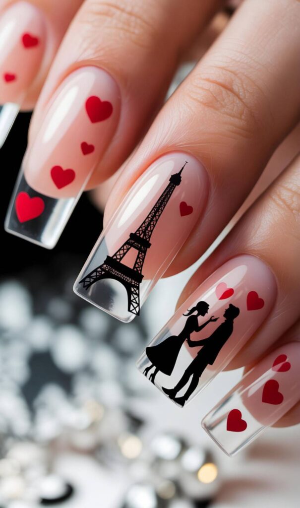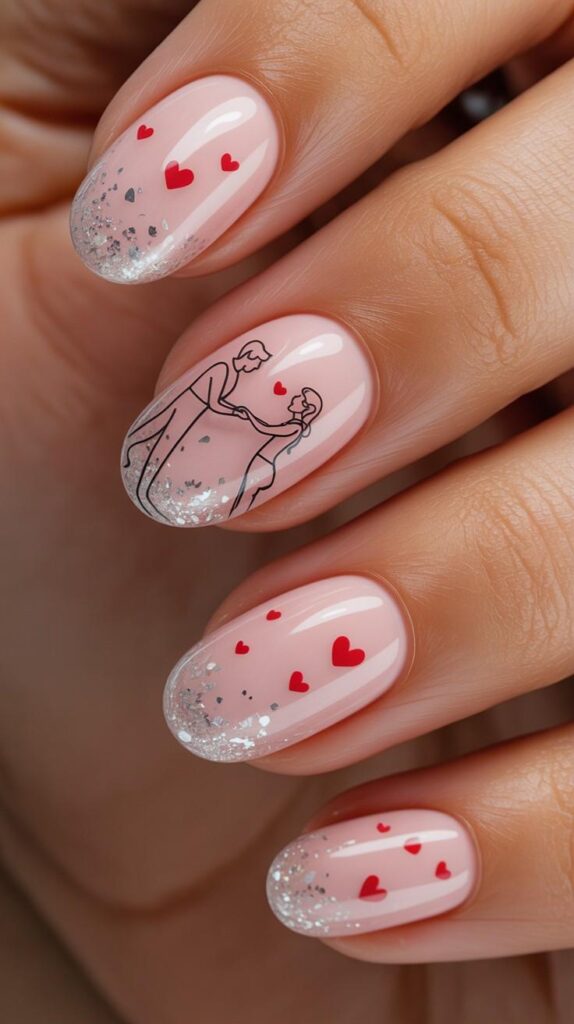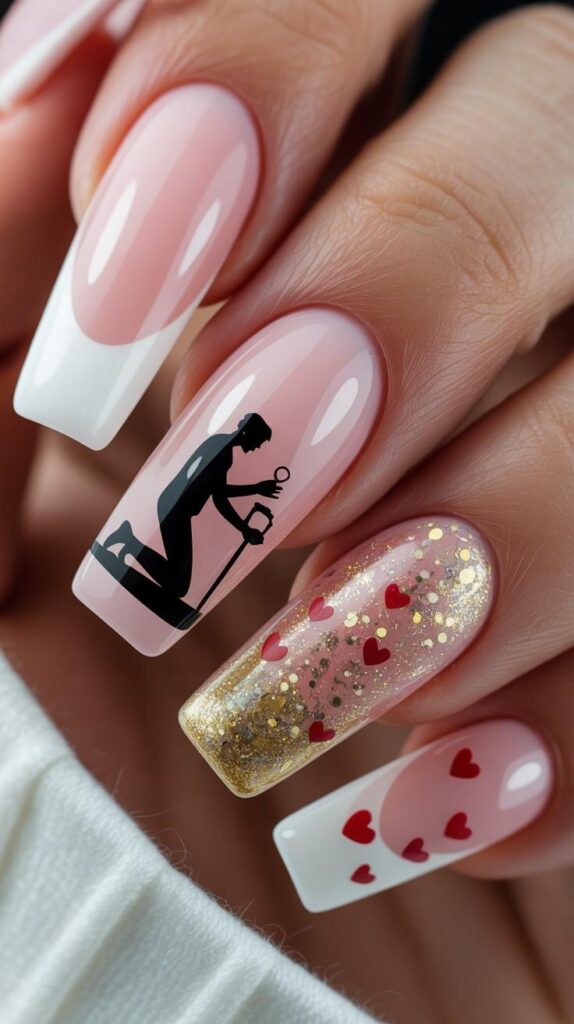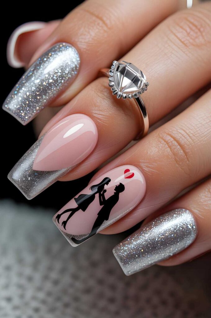 Soft blush pink polish meets bold black silhouette of a couple sharing a kiss under a red heart — paired with dazzling silver glitter tips that shimmer like stardust. The glossy finish catches every glint of light, making it perfect for proposal moments or engagement photos. Paired with a real diamond ring, this design whispers ‘forever starts here’ with every glance.