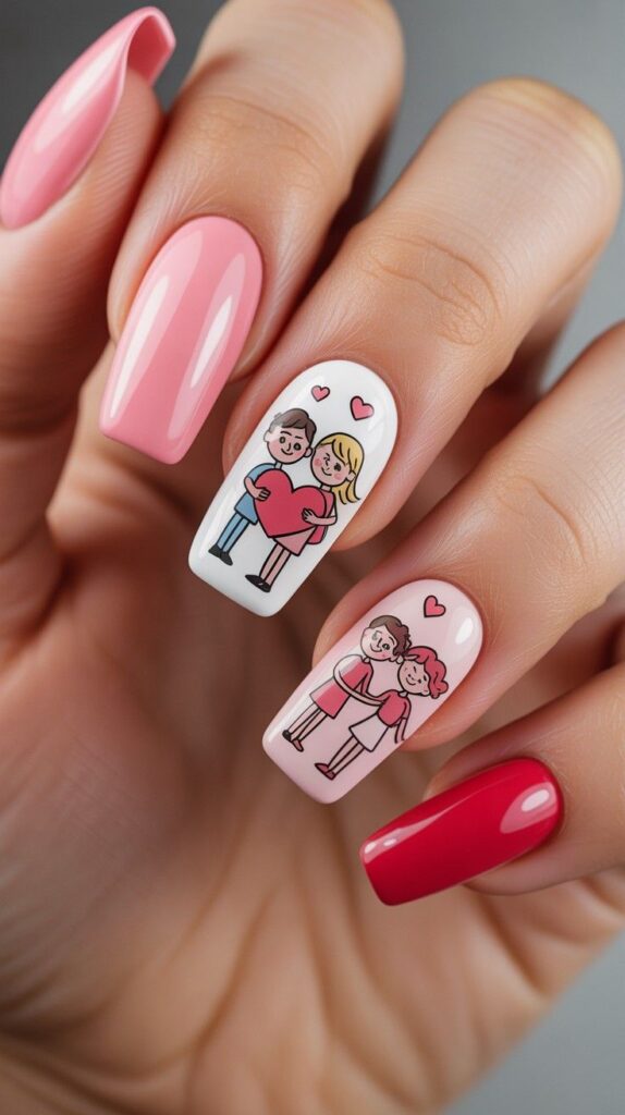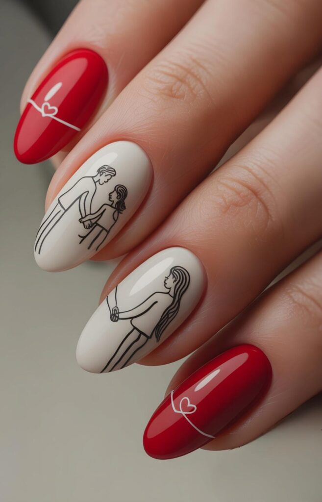 Soft blush pink polish meets bold black silhouette of a couple holding hands with red hearts — playful, romantic, and perfect for showing off your engagement ring. The glossy finish makes it pop without overpowering your look, while the sharp stiletto shape elongates the fingers. Paired with a cozy knit sweater, this design whispers ‘festive glam’ with every step.