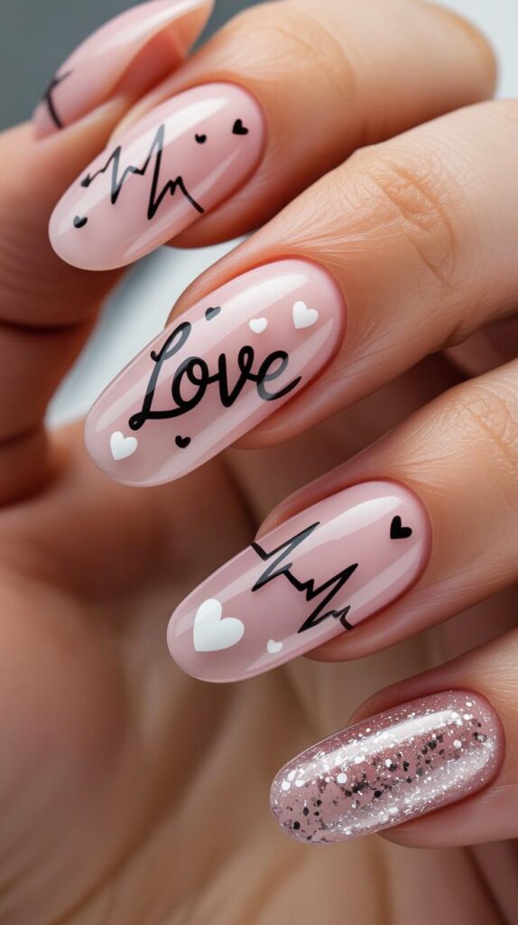 Soft blush pink polish meets bold black script spelling ‘Love’ with white hearts and heartbeat lines — playful, romantic, and perfect for showing off your engagement ring. The glossy finish makes it pop without overpowering your look, while the sharp stiletto shape elongates the fingers. Paired with a cozy knit sweater, this design whispers ‘festive glam’ with every step.