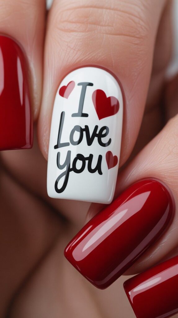 Clean white polish meets crisp black script spelling ‘I Love You’ with red hearts — modern, chic, and perfect for showing off your winter boots. The matte-to-glossy gradient adds depth, while the minimalist base lets the design shine. Paired with real snowflakes, this design whispers ‘minimalist magic’ with every step.