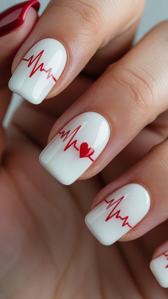 Clean white polish meets bold red heartbeat lines — modern, chic, and perfect for showing off your winter boots. The matte-to-glossy gradient adds depth, while the minimalist base lets the design shine. Paired with real snowflakes, this design whispers ‘minimalist magic’ with every step.
