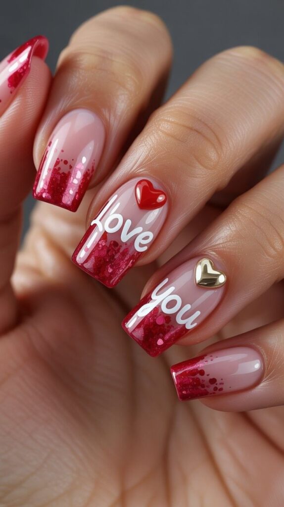 Soft blush pink polish meets bold red glitter tips and crisp white script spelling ‘Love You’ — playful, romantic, and perfect for showing off your engagement ring. The glossy finish makes it pop without overpowering your look, while the sharp stiletto shape elongates the fingers. Paired with a cozy knit sweater, this design whispers ‘festive glam’ with every step.