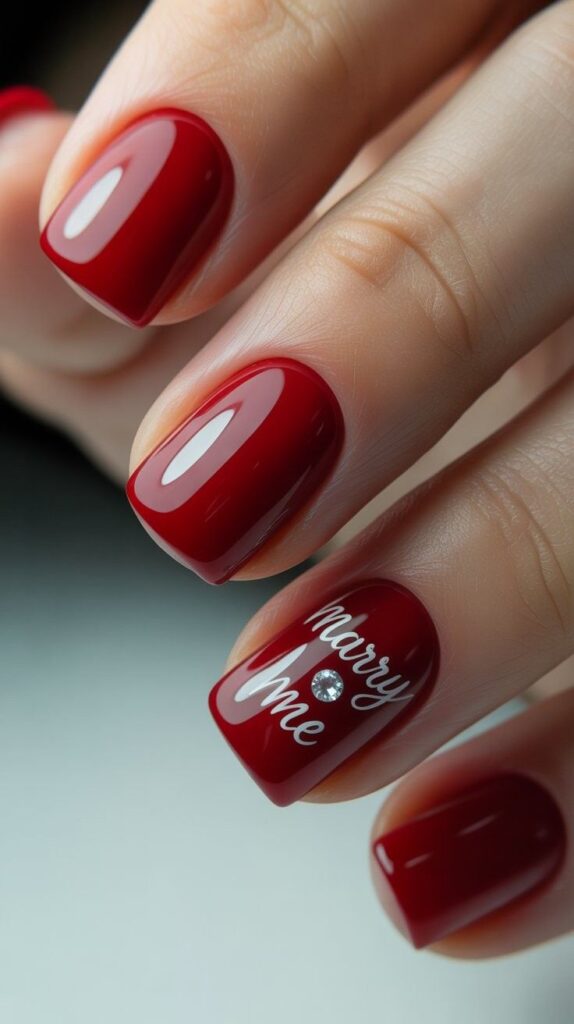 Rich ruby red polish meets crisp white accent nail with elegant red script spelling ‘Marry Me’ — modern, chic, and perfect for showing off your winter boots. The matte-to-glossy gradient adds depth, while the minimalist base lets the design shine. Paired with real snowflakes, this design whispers ‘minimalist magic’ with every step.