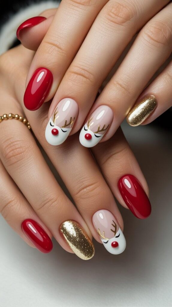 “Crisp white polish frames two accent nails — each featuring a sleepy reindeer face with gold antlers and a red nose. The remaining nails? Glossy red tips for that classic holiday pop — sweet, serene, and totally wearable.”