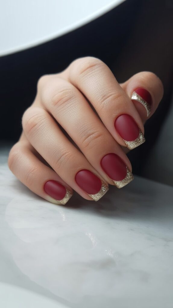 “Soft matte red polish frames two accent nails — each featuring a glossy gold glitter tip. The remaining nails? Speckled with snowy white dots for that ‘just walked through a winter wonderland’ feel — elegant, whimsical, and totally photo-ready.”