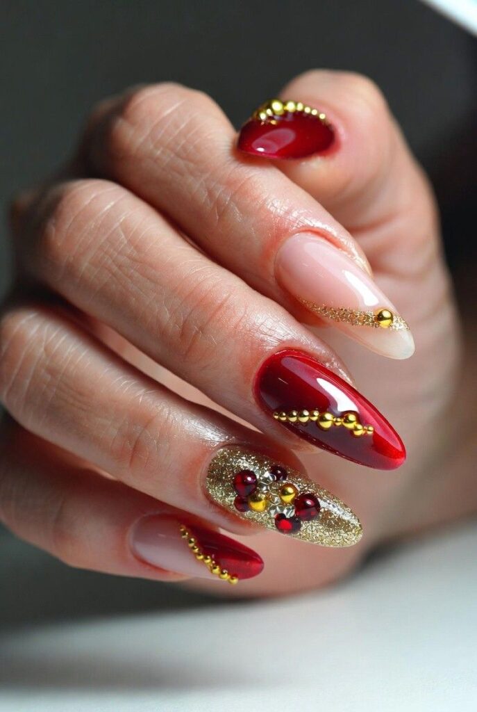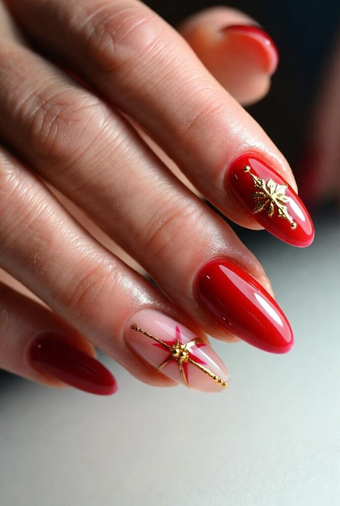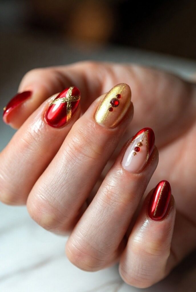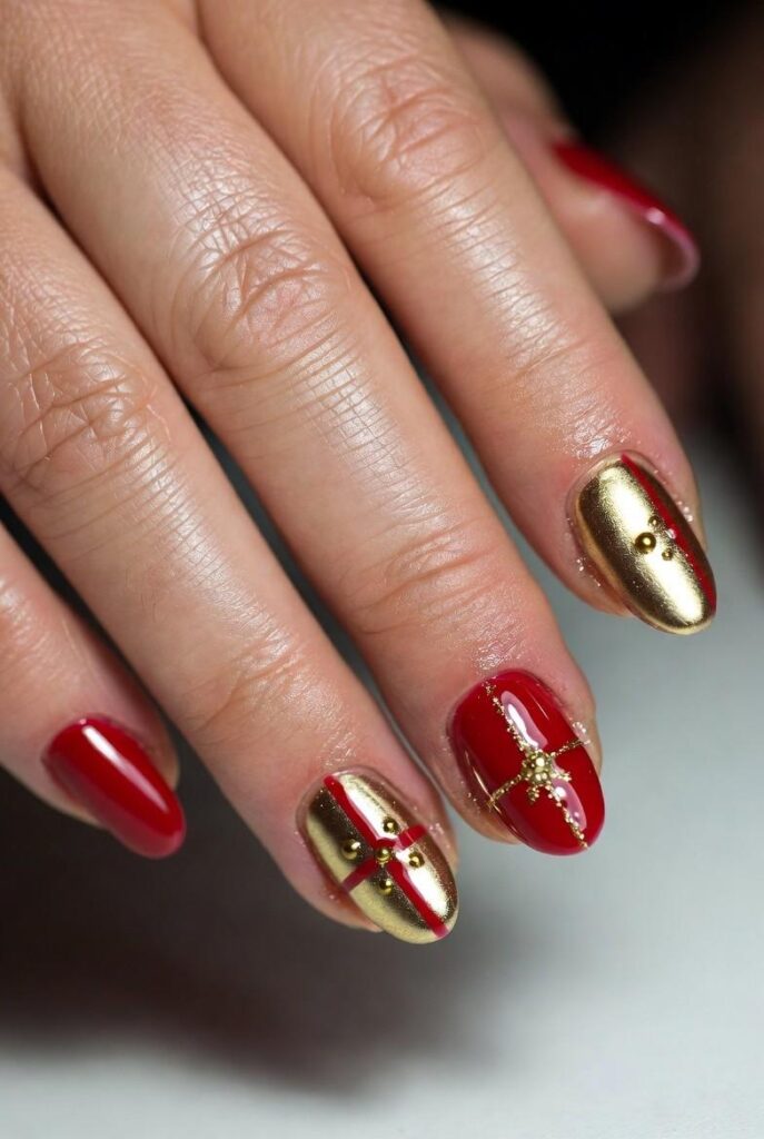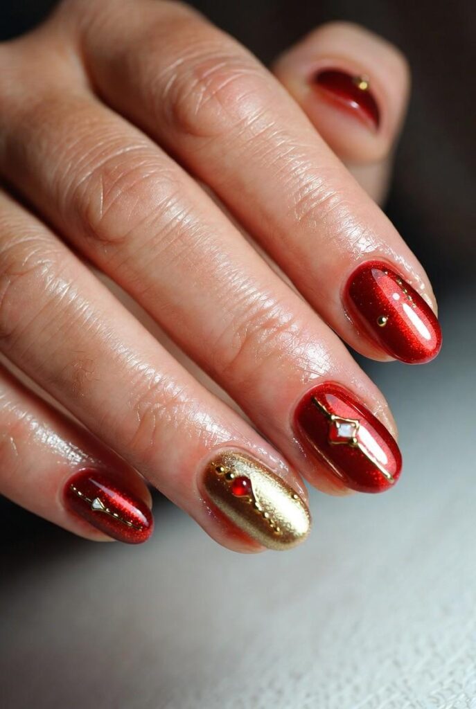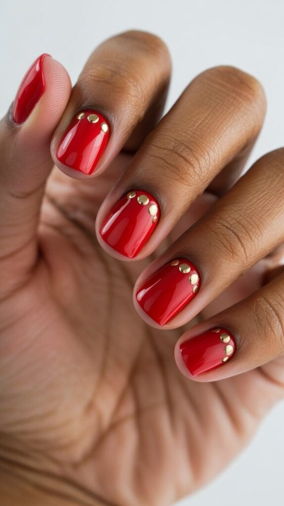 “Bold red polish frames four accent nails — each featuring a delicate gold dot pattern. It’s playful, nostalgic, and packed with charm — like a holiday treat came to life on your fingertips.”