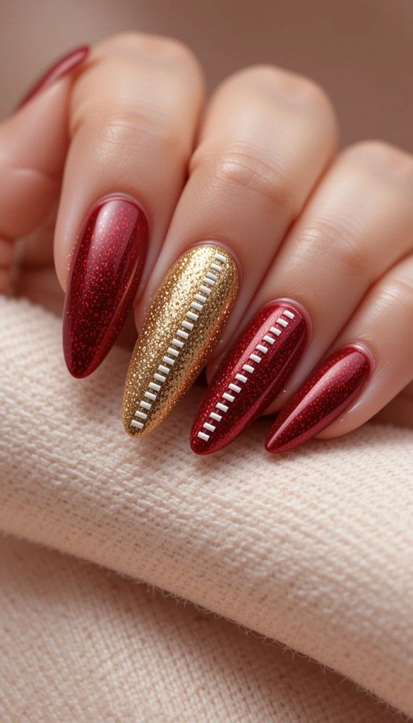 “Rich red glitter coats four accent nails like holiday confetti, while the ring finger steals the show with a glossy gold nail featuring a delicate white zipper design. The high-shine gel finish makes them pop against cozy sweaters or twinkling lights — bold, sparkly, and totally Instagram-worthy.”