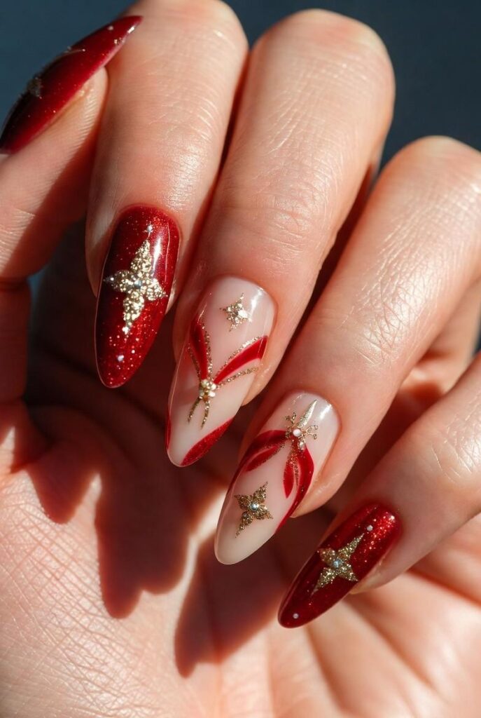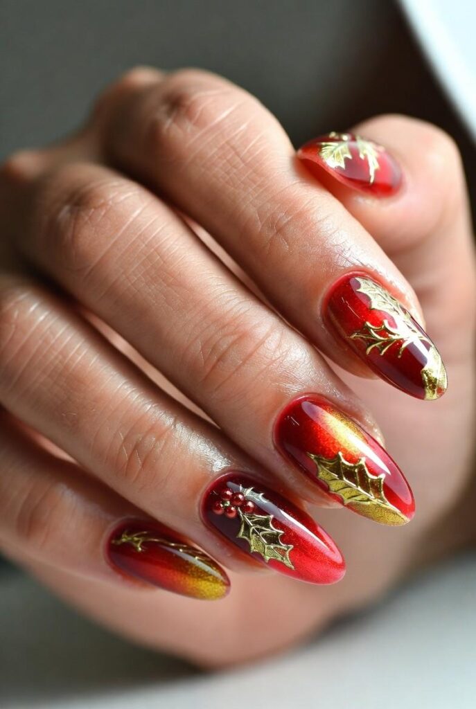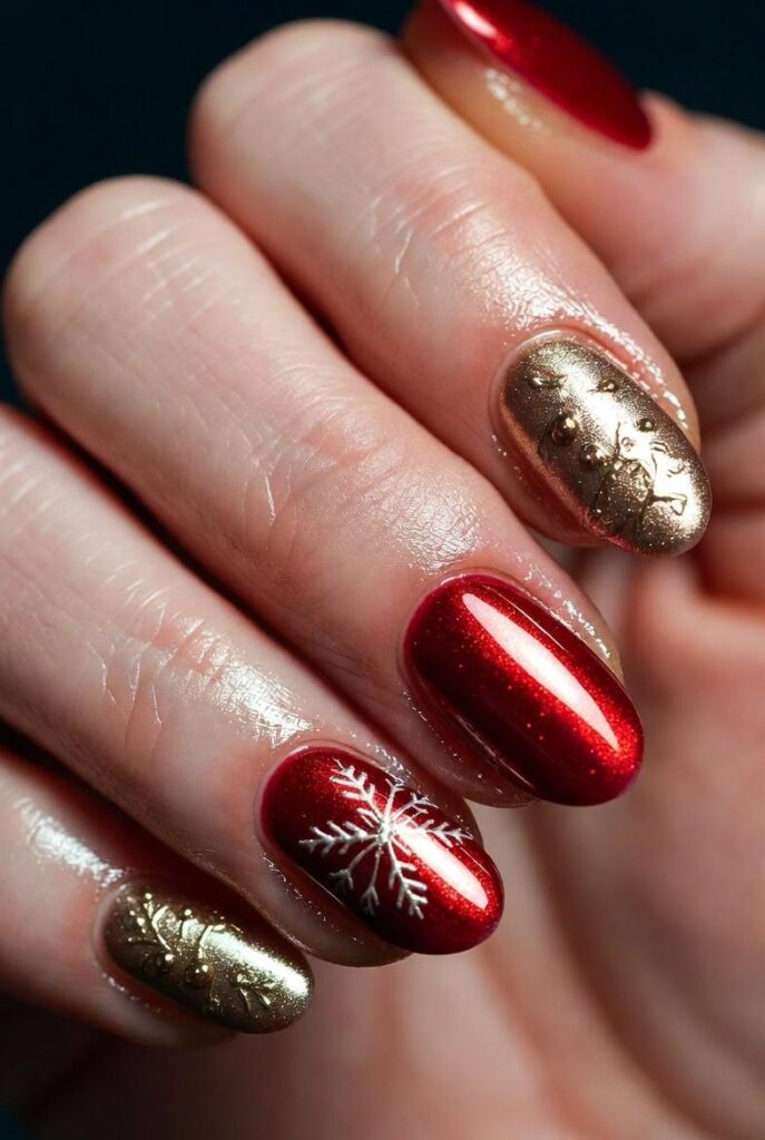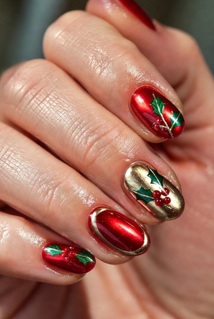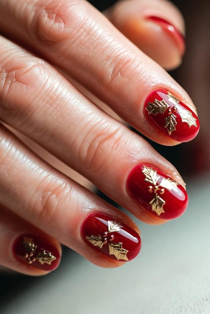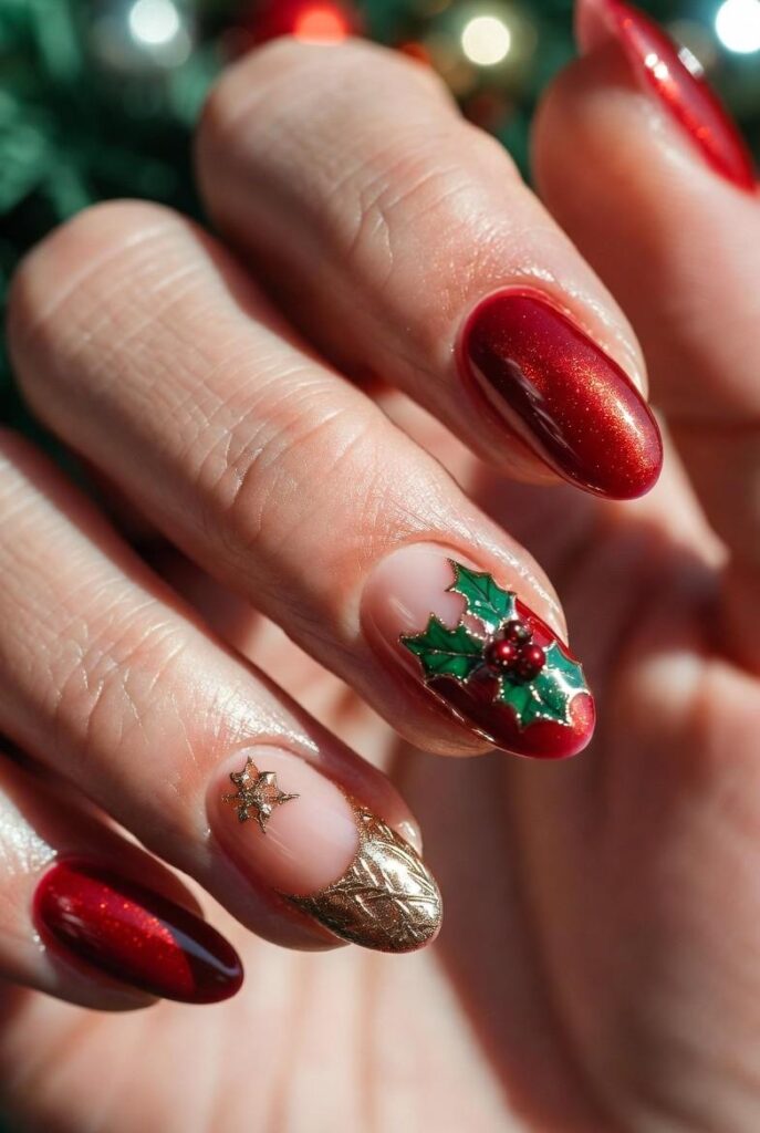 “Vibrant red glitter sets the stage for a whimsical holly leaf on one nail — complete with gold accents and tiny berries. The rest? Sprinkled with snowflakes and holly leaves — like a mini Christmas village living on your fingertips.”