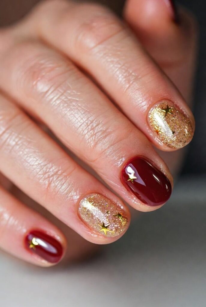 “Bold red polish frames two accent nails — one with a giant gold star, the other a crisp white canvas with a gold glitter fade. The remaining nails? Speckled with snowy white dots for that ‘just walked through a winter wonderland’ feel.”