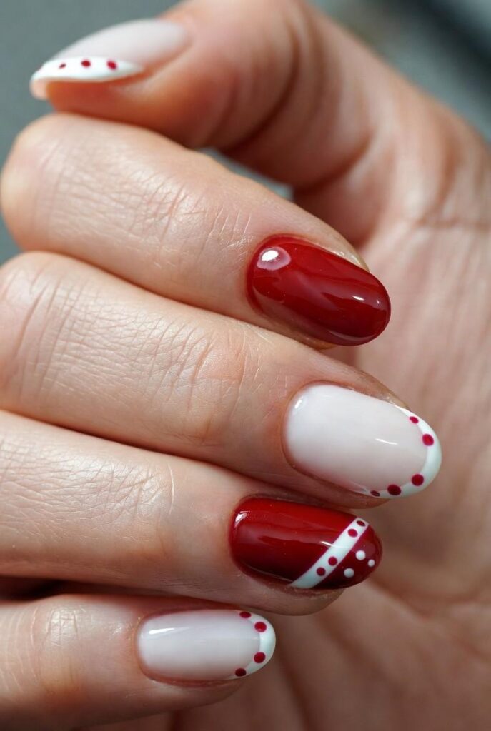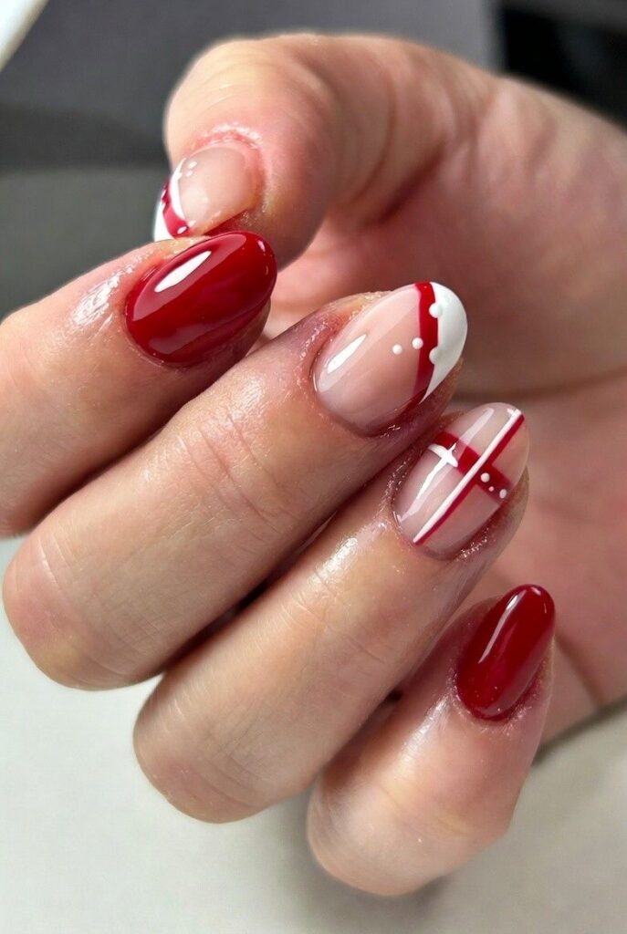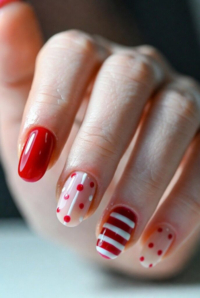 “Glossy red and white polish frames crisp white stripes and polka dots on each nail — simple, bold, and totally festive. It’s like your nails are ready for a holiday parade — fun, flirty, and packed with joy.”