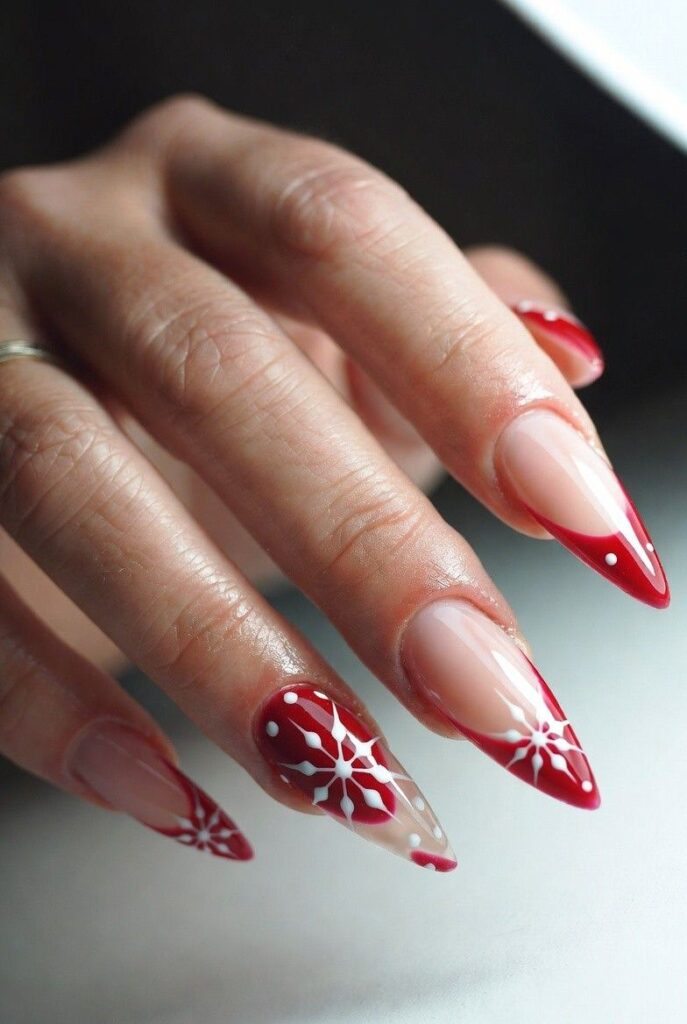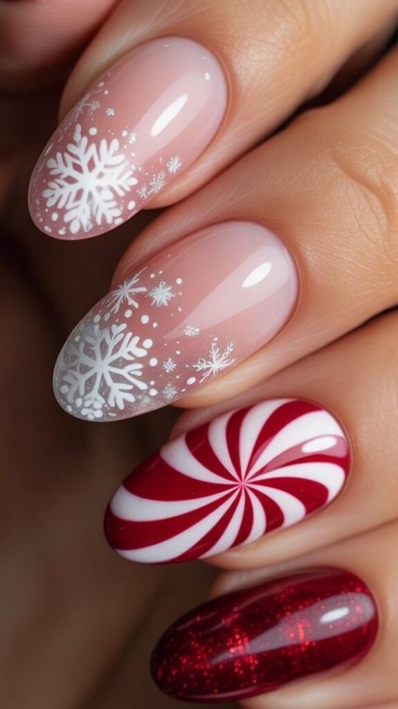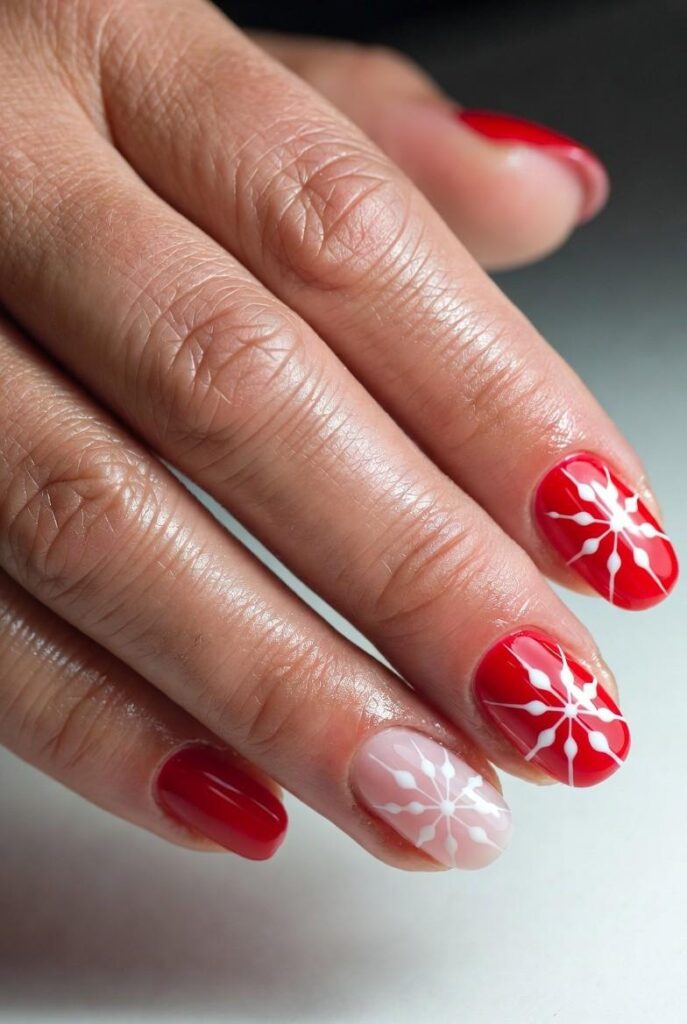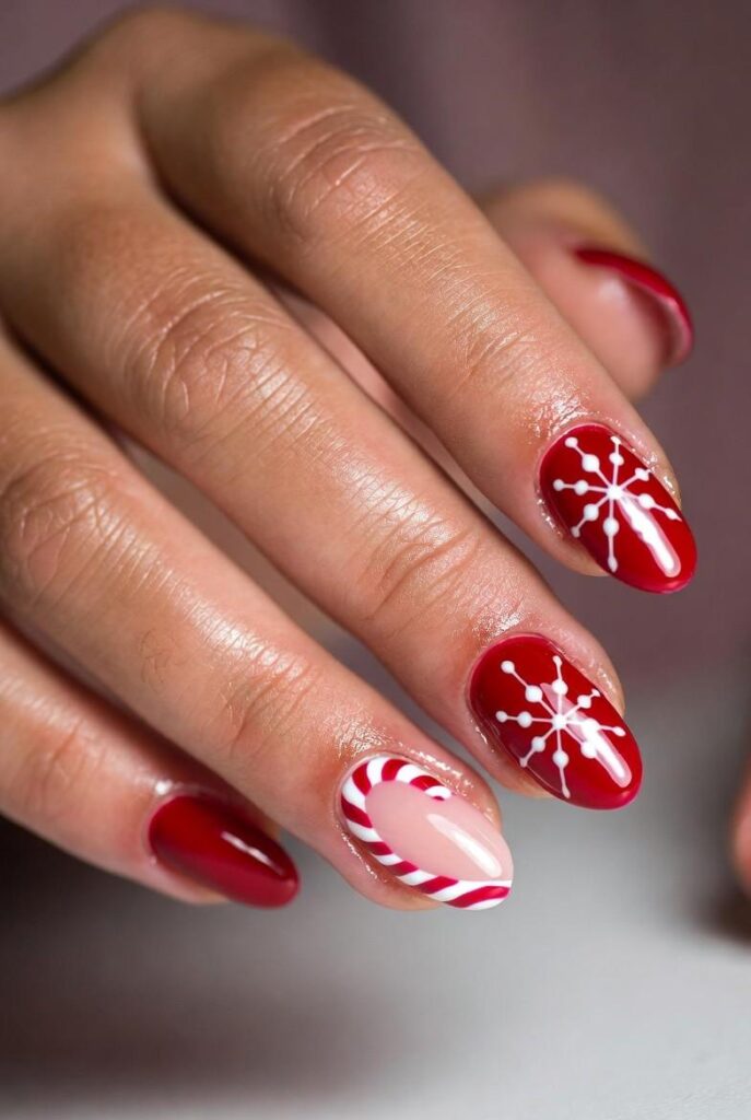 “Glossy red polish frames delicate white snowflakes on each nail, while the ring finger steals the show with a tiny red-and-white candy cane. The rest? Clean, classic, and totally low-key — chic, understated, and perfect for everyday wear.”