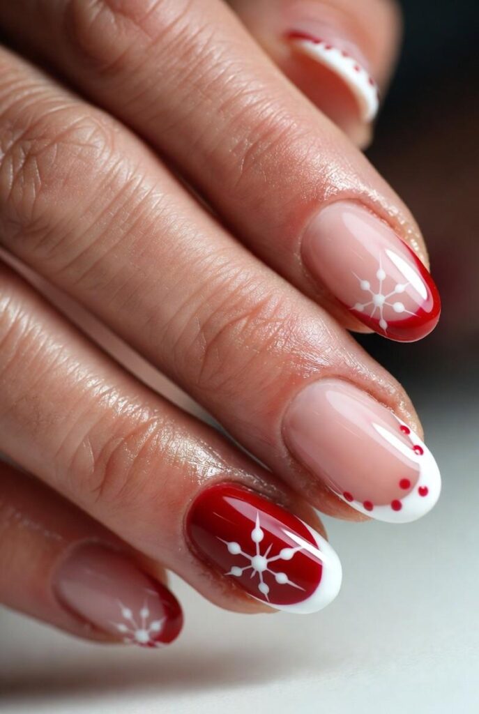 6) Nude Base with Red & White Snowflake Accents